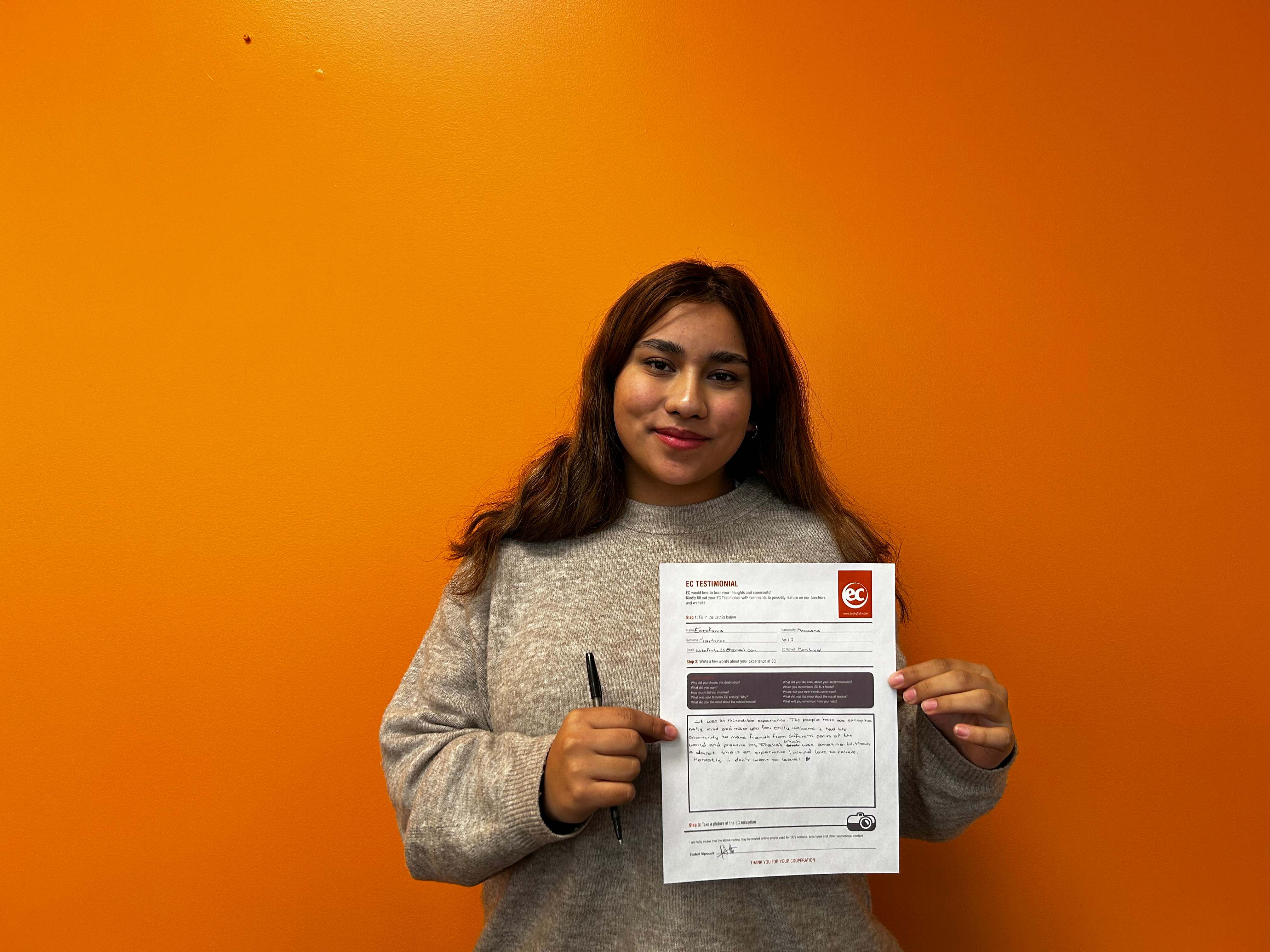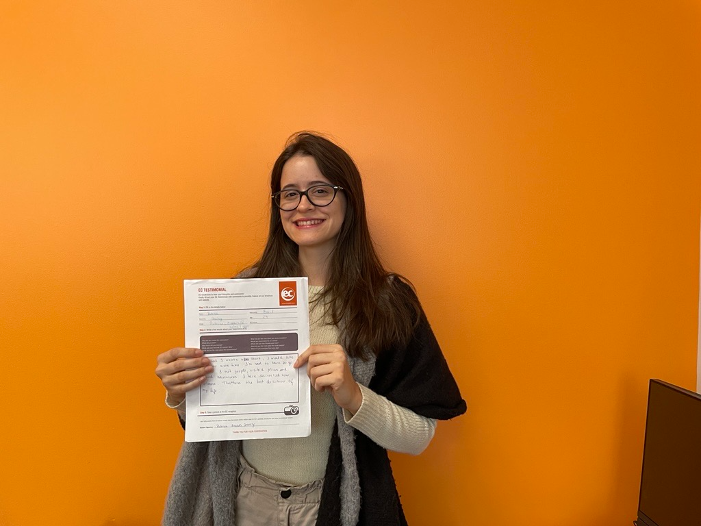 Elegí EC Montreal porque mi sueño era visitar Canadá. Durante mi trimestre aquí, aprendí inglés. Mi actividad favorita en clase era hablar porque me ayuda con la pronunciación. Recomiendo EC Montreal porque los profesores son muy amables y nos escuchan para ayudarnos a aprender inglés. Gracias por esta estancia, fue un momento genial.